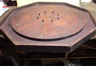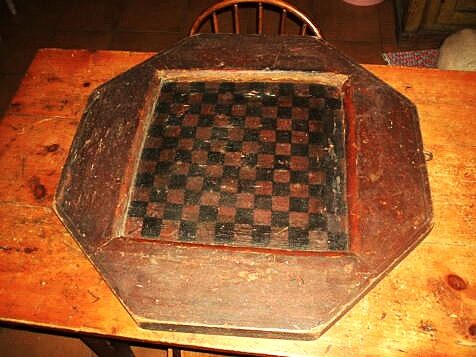 EN PIN SUR SA COULEUR D`ORIGINE ANTIQUE JEUX DE DAME ET DE CROKINOLE OCTOGONALE A BORDURE EMBOUFTE. DIM: 27 1/2 PO DE DIAM. CIRCA 1 ER QUART DE 1900
